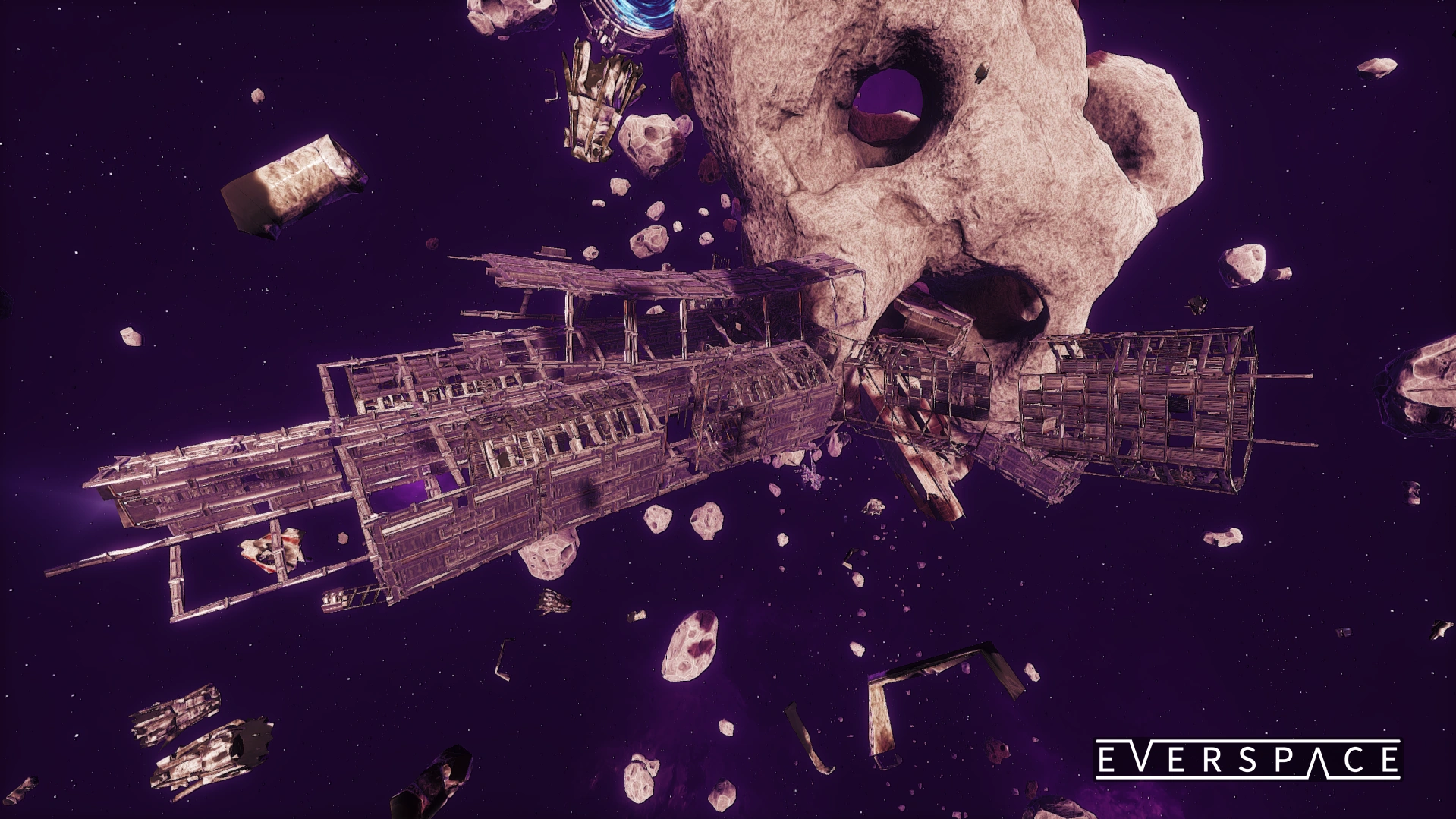 An in-game screenshot of a very damaged derelict station