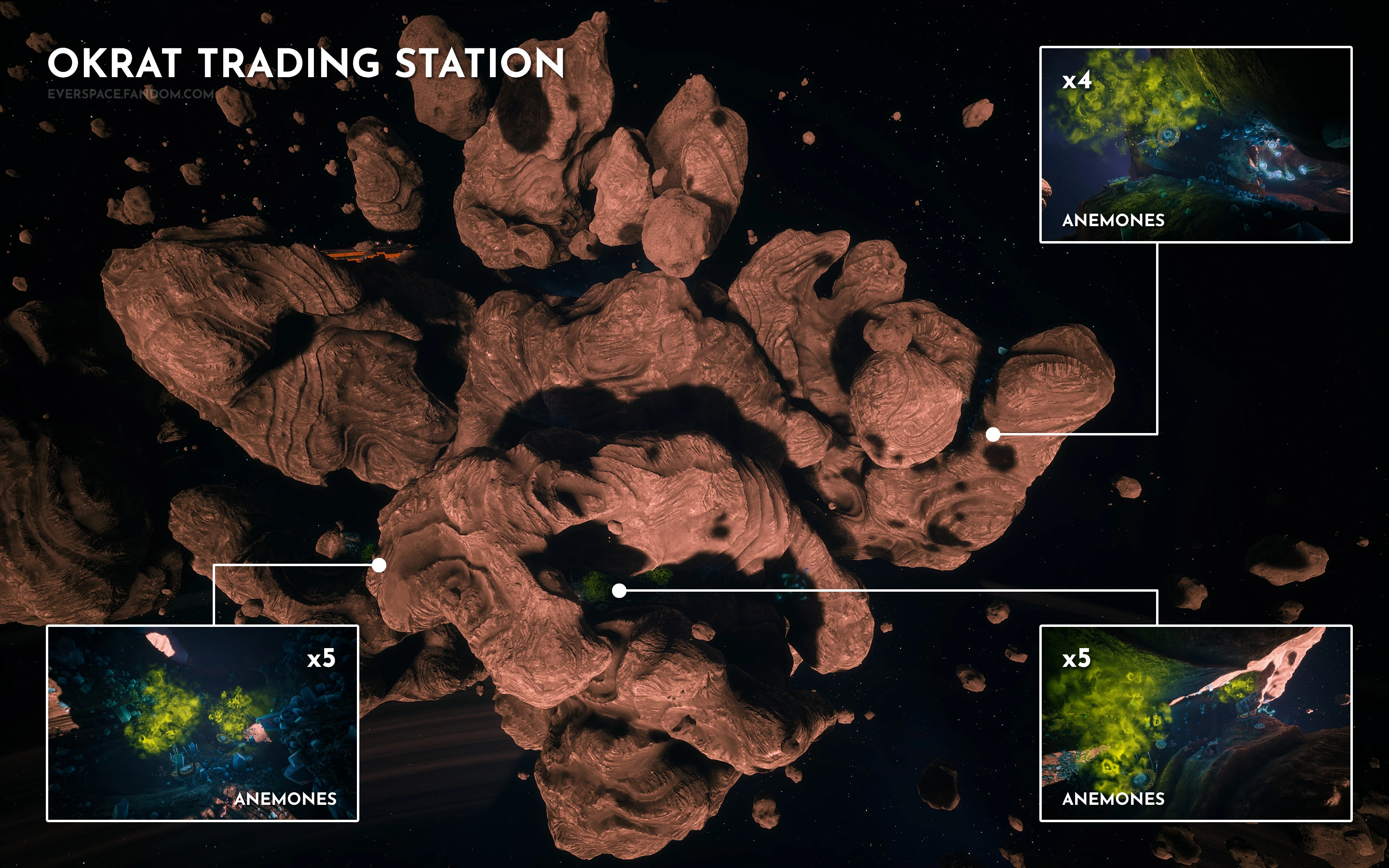 Okrot Trading Station is a site in the Khaït Trench region of the Khaït Nebula system in Everspace 2. This location consists of a large asteroid formation in orbit around the ringed planet Okrot. The large trading station is attached to or built into its dark side. Protected by Okkar patrols.