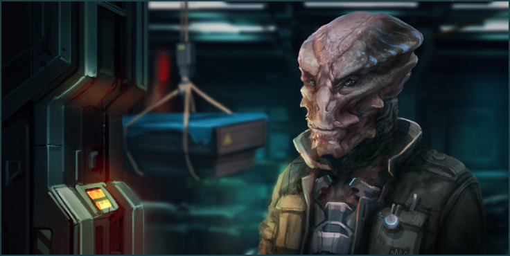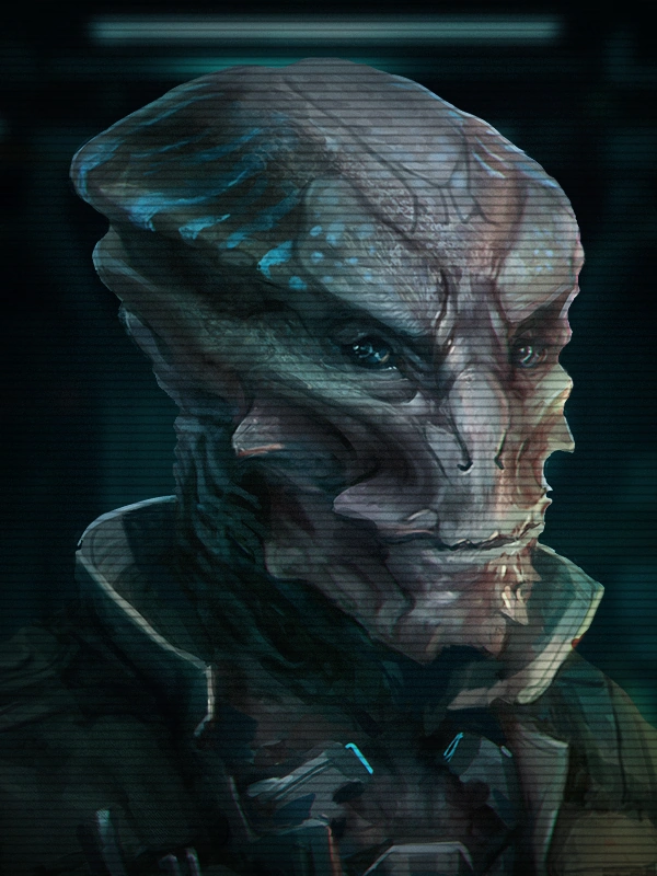 | "Tareen" is the name of an Okkar lone-operator in the DMZ who has been encountered and identified by numerous Outlaw sources. A lone Okkar is an extremely rare occurrence, since they are understood to be eusocial and herd-like, thus Tareen has been marked for further, but distant, observation by Fleet scientists. Tareen operates as a trader in the DMZ and appears to have many contacts with the ability to source powerful weapons and bulk resources. He has so far not been observed to return to the Okkar Homeworlds, and is therefore thought to be a kind of outcast. Those who have done direct business with him have reported him to be amiable but reserved, and only interested in making trade. As such, despite regularly handling and trading illegal goods, he is regarded as a relatively harmless oddity of the DMZ. | |